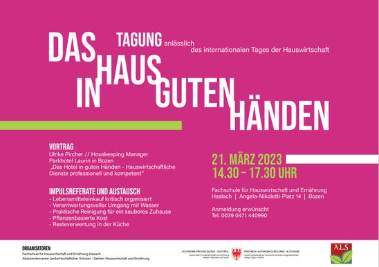 Die Fachschule und der Verein der Absolventen Landwirtschaftlicher Schulen – Sektion Hauswirtschaft und Ernährung lädt Sie herzlich zur Tagung anlässlich des Internationalen Tages der Hauswirtschaft ein.